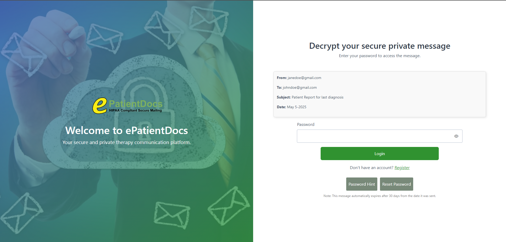 ePatientDocs is a secure, encrypted mailing platform tailored specifically for the healthcare industry. We help hospitals, clinics, and healthcare providers communicate critical medical data with patients and professionals—safely, instantly, and in compliance with HIPAA and global data protection regulations.